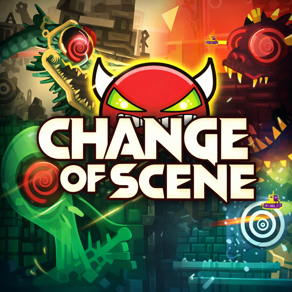 Geometry Dash Change of Scene is an acclaimed Easy Demon user level created and verified by bli for the Discord Gauntlet Contest. Featuring dual mode toggleable at the start and a cinematic journey through theatre, film, video games, and simulation, this level won first place and has been widely praised for its art, effects, and gameplay.